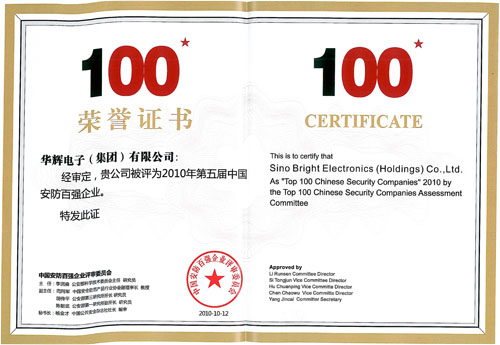 2010年第五屆中國安防100強頒獎典禮”在深圳深航國際酒店舉行。香港華輝電子集團排在外資企業前20強搒中。 中國安防百強評選由公安部科學技術委員會支持,CPS中安網、國際安防品牌實驗室、中國公共安全研究院等主辦,是安全防範行業頗具權威的傳統活動,是評估安防企業在全國市場中實力和地位情況的重要參考依據。