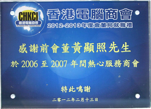集團主席黃顯照先生獲香港電腦商會頒發感謝狀,以表彰其熱心服務商會。